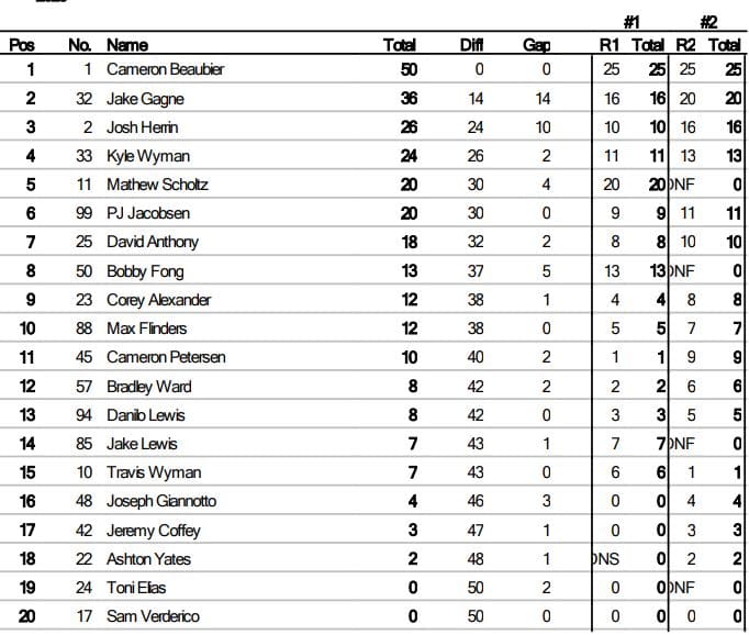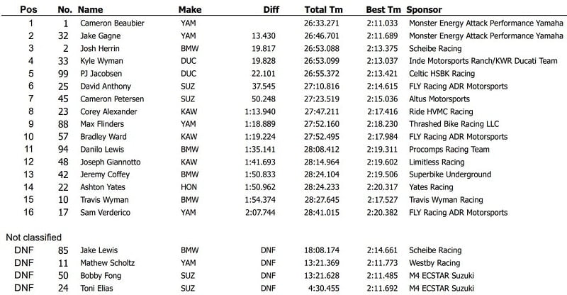 A 4 tours de la fin, Beaubier devançait son coéquipier Gagne de 10.7, puis Wyman, Herrin et Jacobsen de 19.1. Cameron Beaubier remportait finalement sa deuxième course du week-end, prenant un très net avantage au Championnat. Il précédait son coéquipier Jake Gagne, auteur d’un excellent début chez Yamaha, de 13.4, puis Josh Herrin, Kyle Wyman et PJ Jacobsen de 19.8.