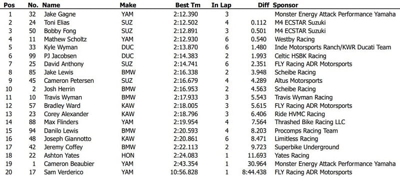 Son coéquipier Jake Gagne était le plus véloce en 2’12.390, devant les deux Suzuki de Toni Elias et Bobby Fong. Ils précédaient Mathew Scholtz, deuxième le samedi, puis les deux Ducati de Kyle Wyman et de PJ Jacobsen.