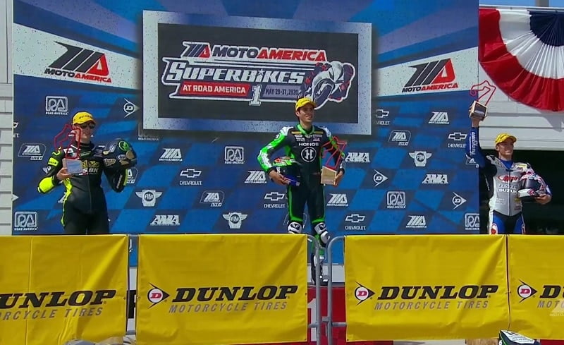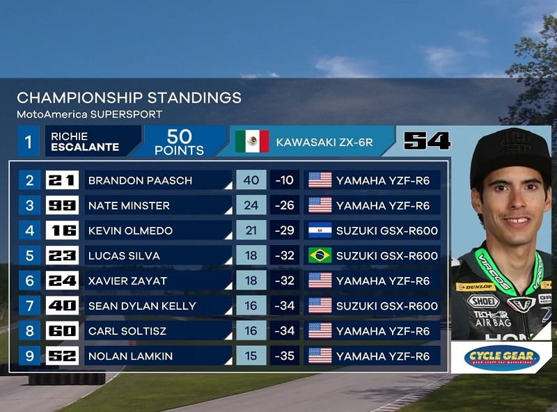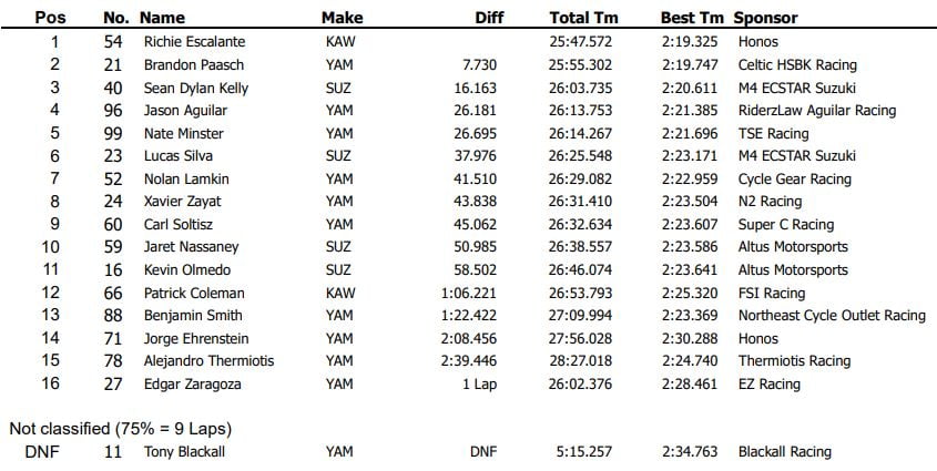 Avec une Kawasaki en pleine forme, dotée d’un moteur préparé chez Graves Motorsport, le Mexicain Richie Escalante a réussi depuis le début du week-end à se maintenir – de peu – devant son principal adversaire Sean Dylan Kelly, équipé d’une Suzuki. Il le précédait samedi lors de la Course 1 quand Kelly chutait sans gravité, tandis que Richie remportait l’épreuve.