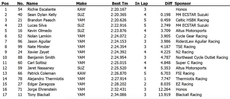 Richie Escalante réalisait le meilleur temps en 2’20.167 devant Sean Dylan Kelly et Brandon Paasch. La surprise était créée par le Brésilien Lucas Silva, coéquipier de Kelly chez M4 Ecstar Suzuki, qui se classait en quatrième position.