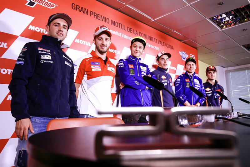 La conférence de presse pré-événement de ce Grand Prix de Gran Premio Motul de la Comunitat Valenciana réunissait Marc Marquez (SPA-Honda), Valentino Rossi (ITA-Yamaha), Jorge Lorenzo (SPA-Yamaha), Andrea Dovizioso (ITA-Ducati), Dani Pedrosa (SPA-Honda) et Hector Barbera (SPA-Ducati).