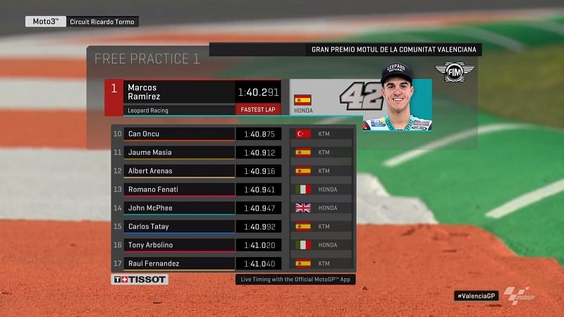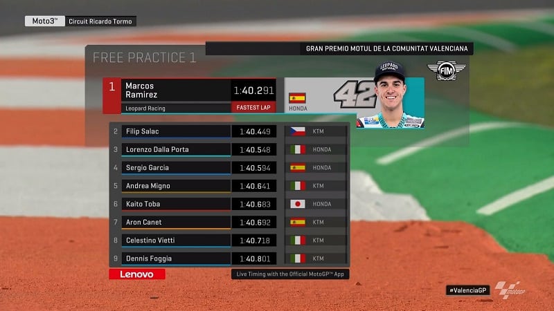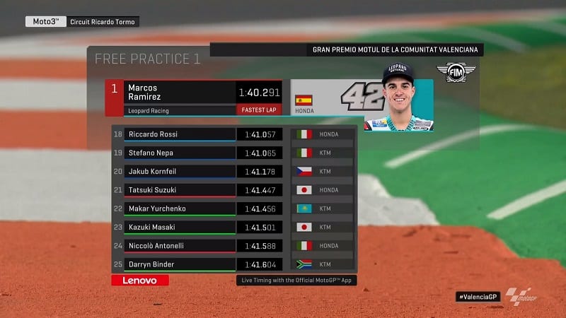 Albert Arenas passait en première position à 18 minutes de la fin en 1’41.256. Romano Fenati le suivait à 0.338, devant Masiá, Migno et Vietti. Vietti est en tête du classement Rookie of the year avant ce dernier Grand Prix avec 24 points d’avance sur Ai Ogura.