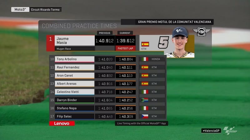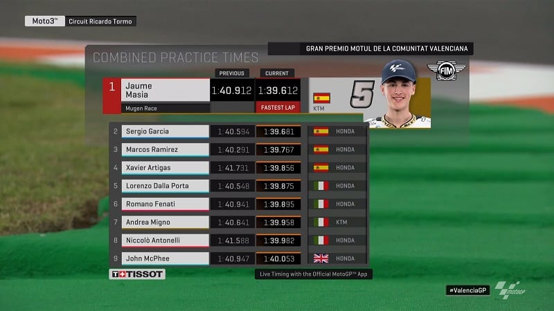 Xavier Artigas, qui débutait en Grand Prix en tant que wildcard pour l’équipe Leopard Racing, était le premier à réaliser un tour rapide en 1’40.600. Il connaissait parfaitement le Circuit Ricardo Tormo pour y avoir beaucoup couru en CEV. Presque aussitôt, Fenati tournait en 1’40.209. Après seulement une dizaine de minutes, le meilleur chrono du matin n’était plus qu’un lointain souvenir.