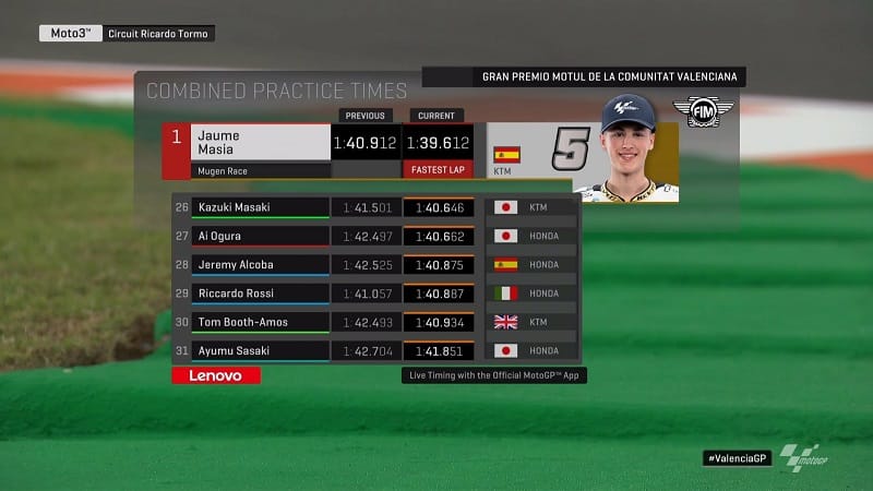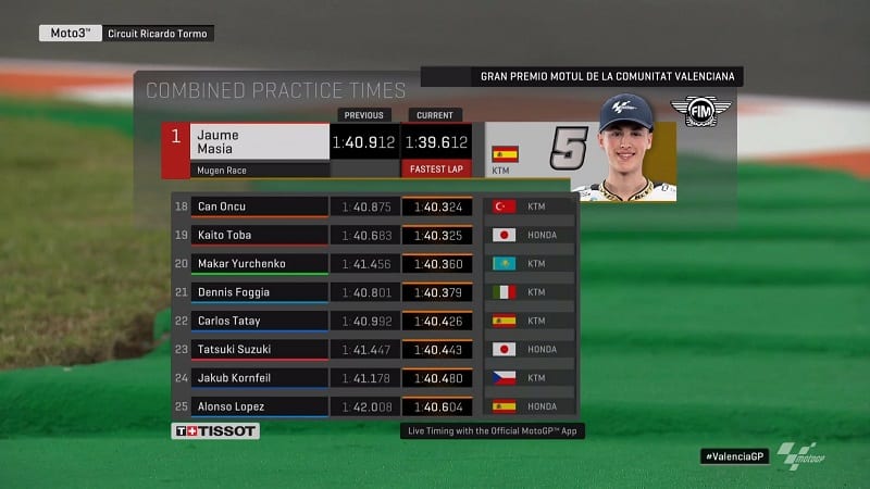 Jaume Masiá améliorait encore en 1’39.743, précédant le nouveau Champion du Monde Lorenzo Dalla Porta en 1’40.044.