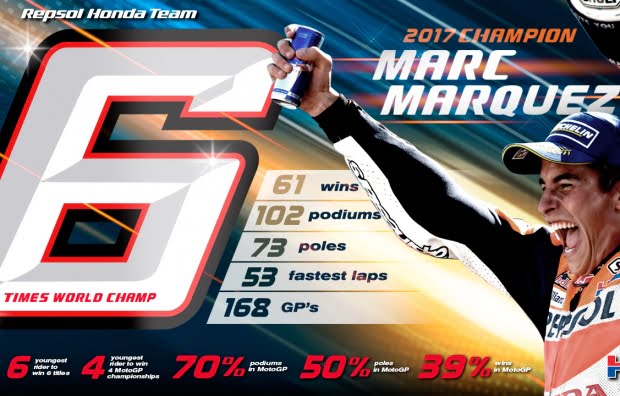 Voilà, c’est fini ! Une magnifique saison avec des rebondissements, des revirements, des changements de leaders, mais avec un Marc Márquez encore titré, pour la seconde fois consécutive. Et la quatrième en MotoGP, sa sixième couronne absolue, à 24 ans seulement. MM93 écrit l’histoire avec un talent hors du commun doublé d’une veine insolente, un équilibre parfait qui lui permet de rétablir des situations perdues sur sa Honda. Encore ce dimanche, il a évité miraculeusement une chute qui aurait pu le privé de ce sixième sacre…
