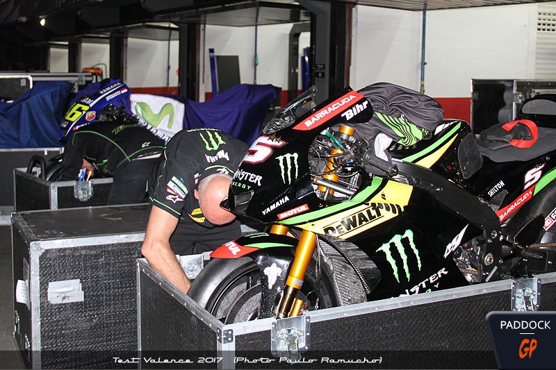 Les motos ont donc été chargées dans leur caisse de transport aérien et, du côté de Tech3, on a visiblement récupéré une moto utilisée aujourd’hui par Valentino Rossi, en plus de la M1 en configuration 2017 pilotée par Johann Zarco durant ce test.