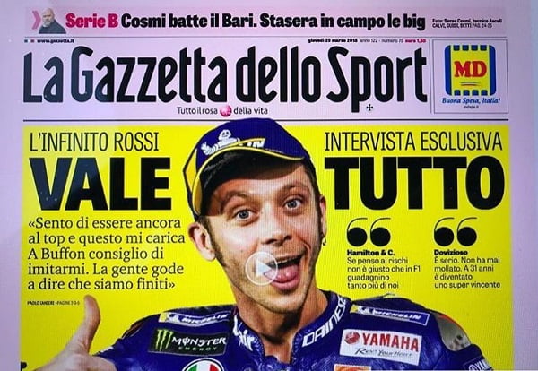 Selon la Gazzetta dello Sport (version papier), pour Valentino « Courir sur la piste, seul, avec sa moto est toujours spécial, en essayant de gagner une course, le Championnat du monde.