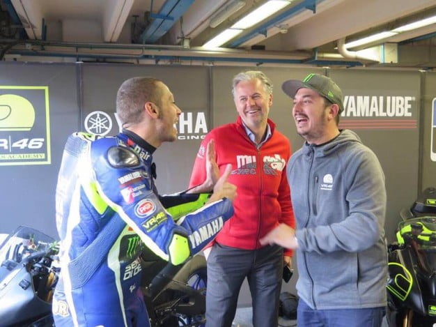 L’ambiance était apparemment très décontractée pour cette opération mise en place par Yamaha et VR 46, le nonuple champion du monde apparaissant complètement libéré après son début de saison qui le voit poindre à la première place du classement général des pilotes.