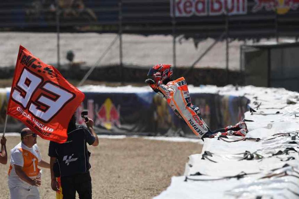 Après avoir accompli ses 27 tours du Grand Prix d’Espagne sans commettre la moindre erreur malgré une attaque maximale (voir sa courbe ici), Marc Márquez a tenu à saluer ses fans en montant sur une Airfence lors de son tour d’honneur.