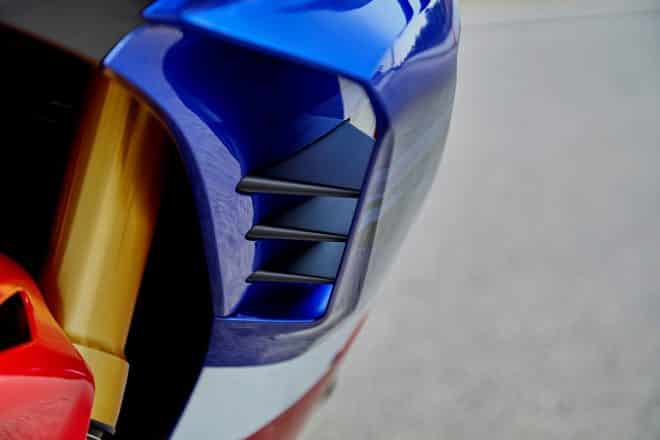 On trouve aussi un nouvel optique à LED accompagnées d’un ensemble de spoilers latéraux – avec trois appendices à l’intérieur de chaque côté – qui maximisent l’effet d’appui du train avant inspiré du design de la RC213V de l’année dernière.