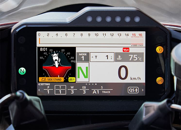 La variante SP bénéficie d’une fourche Öhlins NPX de 43 mm gérée par un calculateur Öhlins Electronic Control (S-EC) qui, conjointement avec l’amortisseur arrière Öhlins TTX36 Smart EC propose une suspension électronique semi-active complète de deuxième génération, permettant au pilote de choisir entre une configuration par défaut et trois personnalisées individuellement pour les trains avant et arrière.
