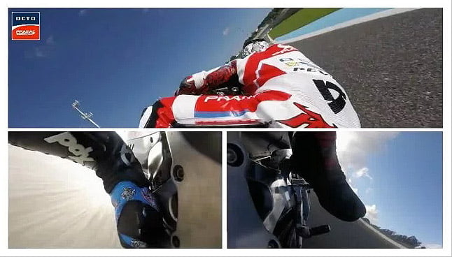 Voici maintenant un intéressant montage avec trois angles de vues simultanées qui réunit ces différentes facettes du pilotage d’une MotoGP.