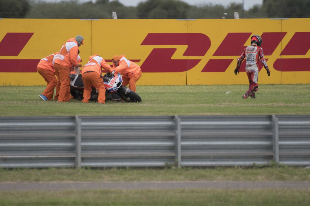 RIO HONDO, ARGENTINA - APRIL 09: Jorge Lorenzo of Spain and Ducati Team walks out of track after crashed out during the MotoGP race during the MotoGp of Argentina - Race on April 9, 2017 in Rio Hondo, Argentina. (Photo by Mirco Lazzari gp/Getty Images)