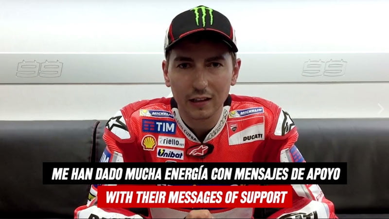 Après sa troisième place au Grand Prix d’Espagne à Jerez, Jorge Lorenzo a envoyé un message sur les réseaux sociaux, dans lequel il remercie en italien les fans qui lui sont restés fidèles malgré ses difficultés de début de saison, et prône la solidarité avec tous les aficionados de Ducati.