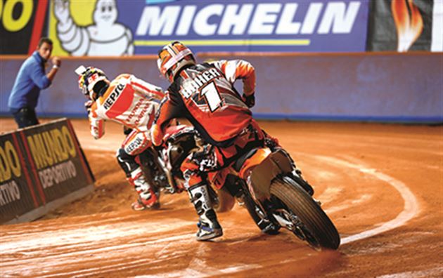 Avec Marc , vous pouvez à coup sûr voir une certaine influence du dirt track sur son pilotage. On dirait qu’il est toujours en train de chercher les limites. Il a la mentalité qui aide et comme il gagne en expérience, il laisse de plus en plus la moto bouger. Cela semble maintenant naturel pour lui. Mais vous pouvez à coup sûr repérer les pilotes d’asphalte quand ils s’essaient au dirt track! Leur positionnement corporel, et la façon dont ils sont assis sur la moto, sont bons, mais la façon dont ils utilisent leur corps implique que vous pouvez dire de leur style qu’ils sont des pilotes sur asphalte. Je pense que vous pouvez voir une évolution dans leurs styles, que ce soit Marc ou Valentino, car il y a une progression. »