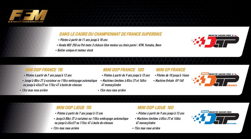 Ce dernier reprend les mêmes catégories et y ajoute la formule créée par Dorna Sports, la Mini GP France, à partir de 10 ans sur des motos Ovhale GP160.