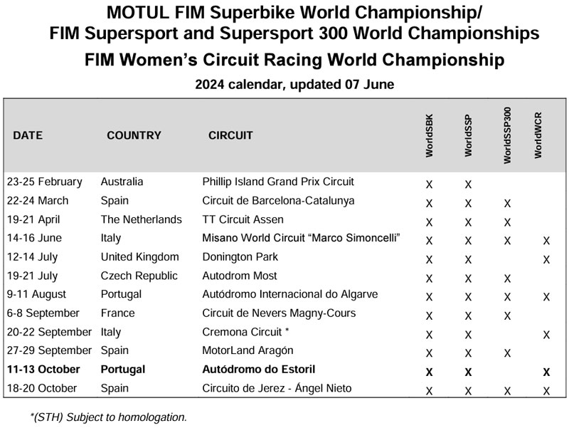 Le calendrier de la saison 2024 du Championnat du monde de Superbike WorldSBK sera modifié et le circuit portugais d’Estoril accueillera la 11e manche de la saison.