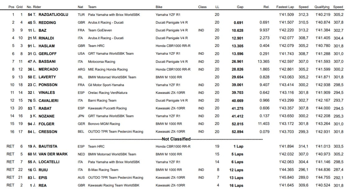 | Superpole | 1’40.676 Jonathan Rea | 1’40.219 Toprak Razgatlioğlu |