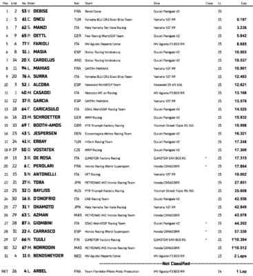 Manzi, légèrement décroché, choisit d’assurer en troisième position à plus de trois secondes des leaders. Cette attitude prudente l’éloigne d’un sacre immédiat, mais rapproche le pilote italien d’un premier titre mondial. Pour Oncu, ce nouveau podium, le treizième de la saison, et la troisième place de Manzi permettent à Yamaha d’atteindre 440 podiums en WorldSSP.