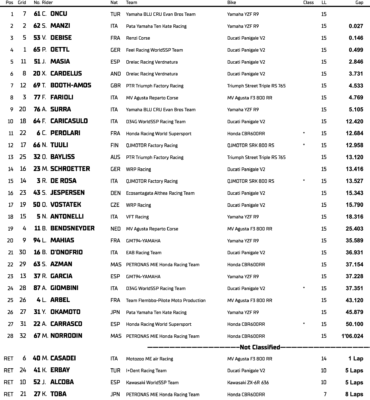 Lucas Mahias part à la faute dans le premier virage et perd gros au général en terminant seulement vingtième. La prochaine manche du championnat aura désormais lieu le week-end du 12 octobre à Estoril.