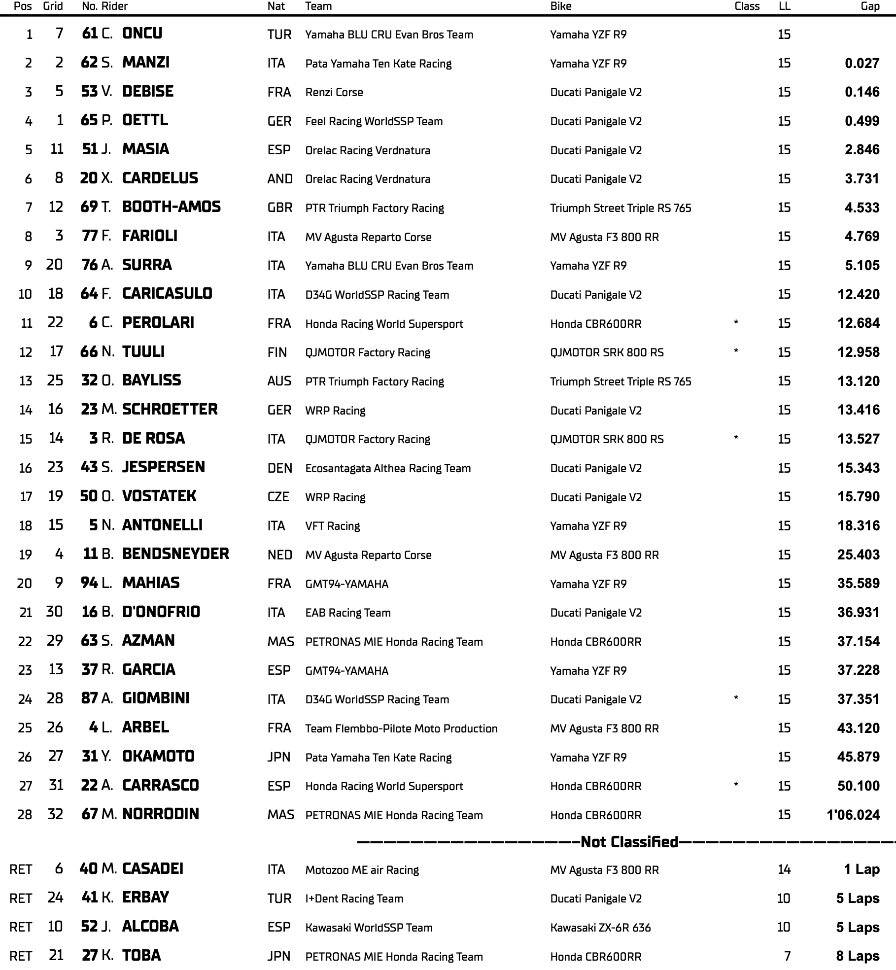 Ce duel au sommet n’est pas sans conséquences. Avec cette victoire, la première depuis Donington, Oncu se repositionne clairement comme la menace n°1 pour Manzi, qui voit son avance fondre alors que la saison approche de son épilogue. Le podium du jour, symbole de régularité, récompense aussi une progression constante : Debise (Renzi Corse) s’offre ainsi son quatrième podium de la saison, Manzi son seizième.
