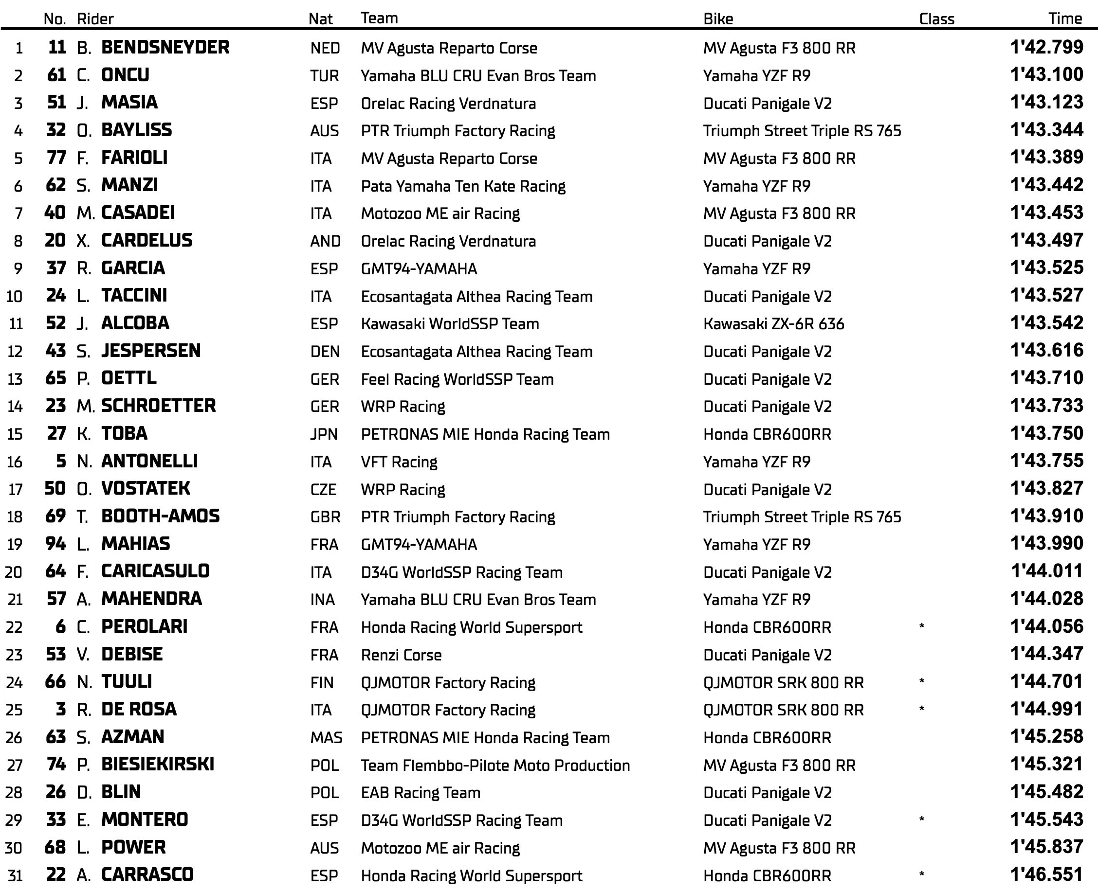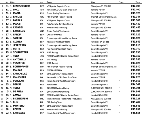 Derrière eux, Oli Bayliss (PTR Triumph Factory Racing) confirme sa progression en signant le quatrième temps (1’43.344), suivi de Filippo Farioli (MV Agusta Reparto Corse) en cinquième position (1’43.389). Le leader du championnat, Stefano Manzi (Pata Yamaha Ten Kate Racing), devra partir de la sixième place après une qualification difficile.