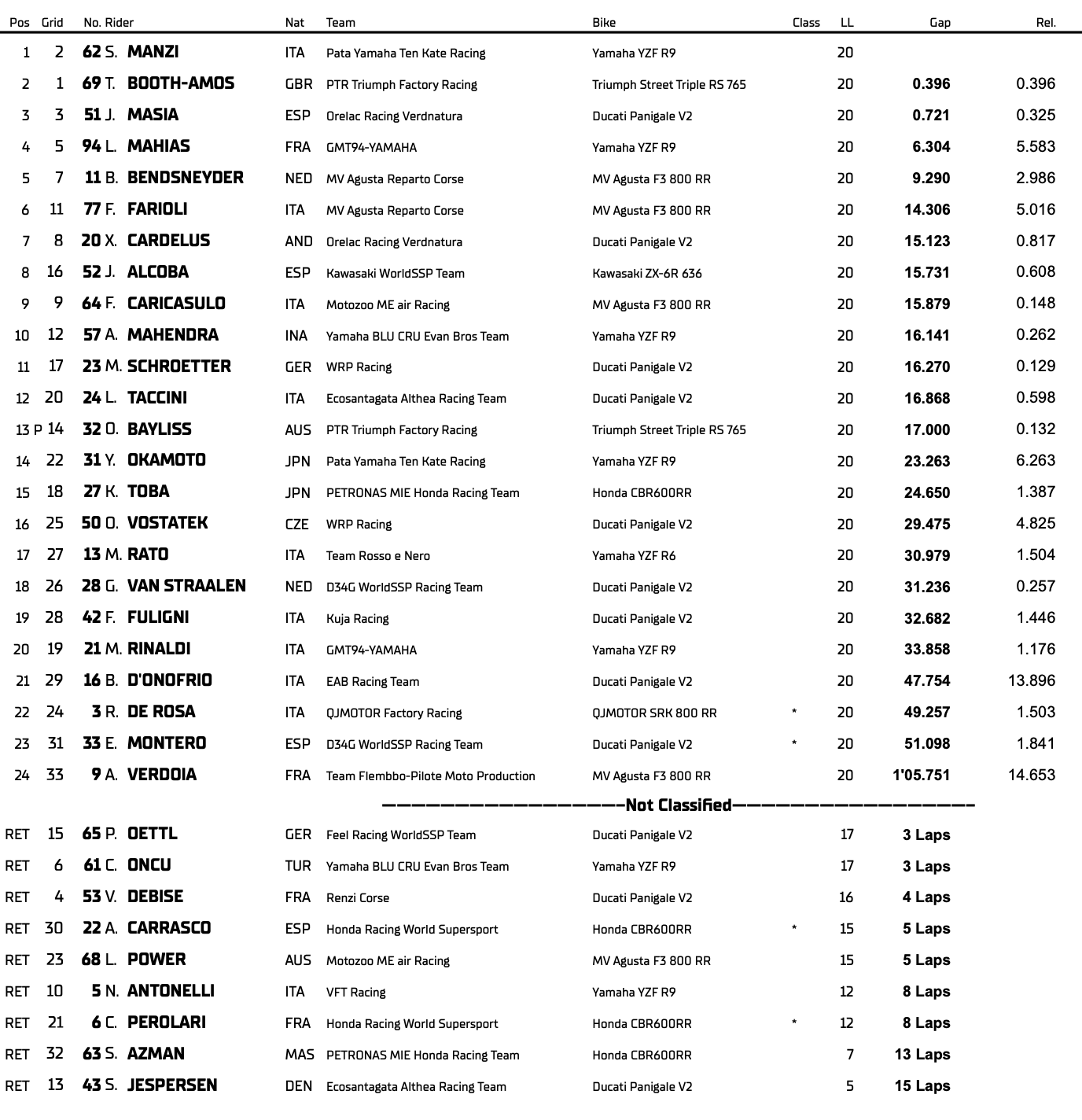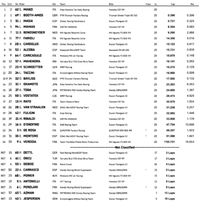 Lucas Mahias (GMT94-YAMAHA) a terminé à la quatrième place, signant son troisième résultat similaire de la saison. Bo Bendsneyder (MV Agusta Reparto Corse), après un mauvais départ, a dû se contenter de la cinquième position, tandis que son coéquipier Filippo Farioli, sanctionné d’un Long Lap Penalty, termine sixième.