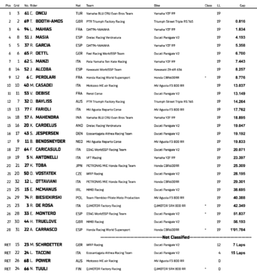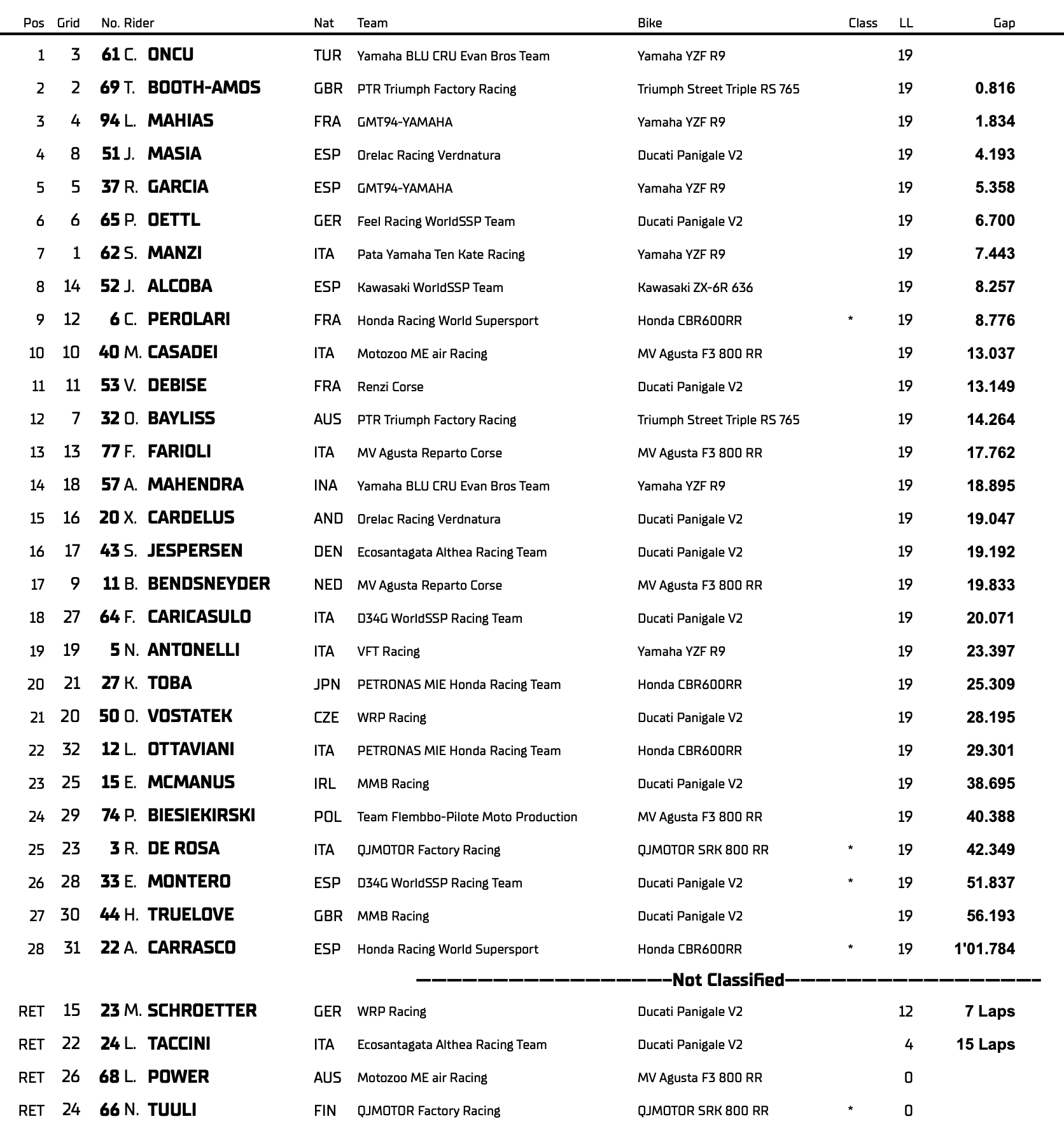 Après son erreur initiale, Manzi a entamé une remontée méthodique, grappillant des positions pour finir septième. Il conserve la tête du championnat, mais voit son avance sur Oncu réduite à 45 points. Derrière, Jeremy Alcoba (Kawasaki WorldSSP Team) termine huitième après avoir résisté aux attaques d’Oli Bayliss (PTR Triumph Factory Racing), qui complète le top-10 après une course solide en réaction à sa chute de la veille.