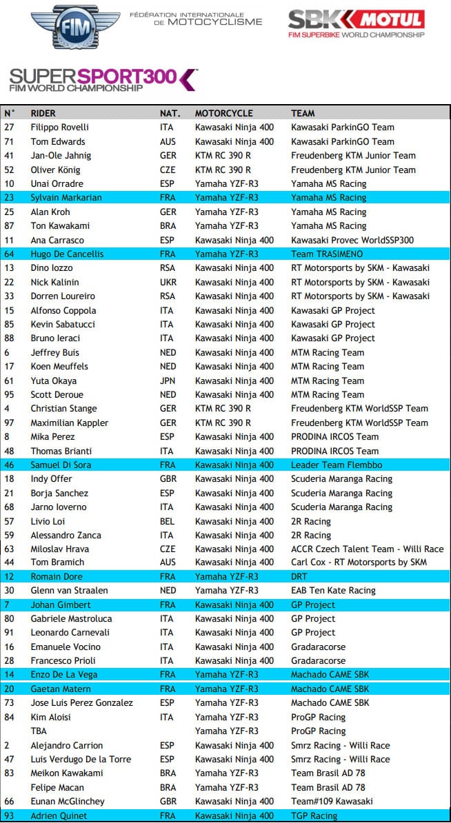 Ana Carrasco (Kawasaki Provec WorldSSP300) poursuit en WorldSSP300 et figurera une fois de plus parmi les favoris. La saison passée, elle a battu son record de points inscrits en WorldSSP300, tout en terminant troisième du classement, derrière González et Scott Deroue (MTM Racing Team), un autre grand favori du championnat.