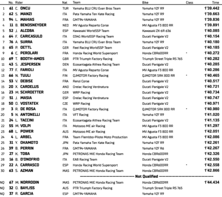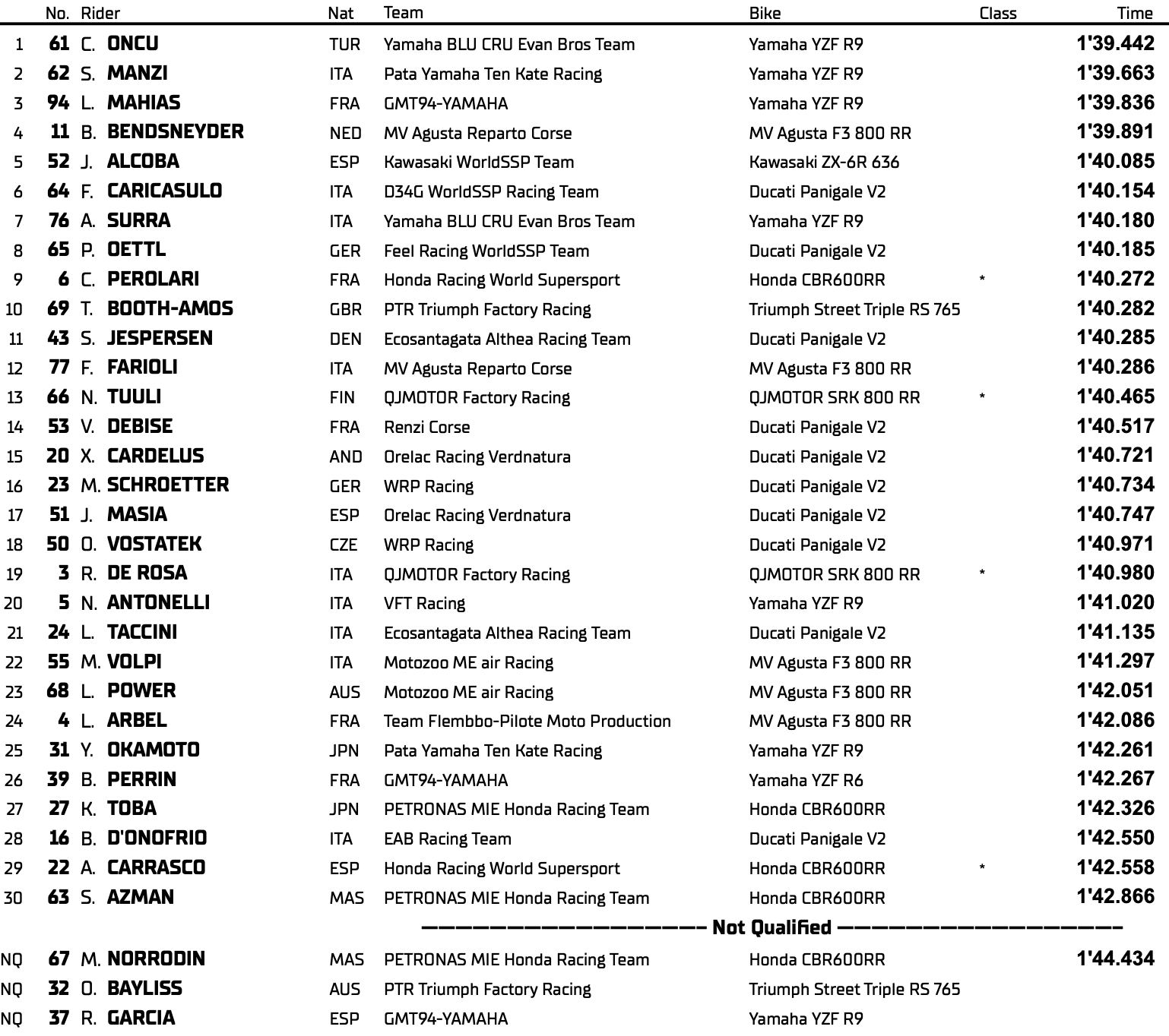 La séance de Superpole a vu Can Oncu (Yamaha BLU CRU Evan Bros Team) s’emparer du meilleur chrono pour la troisième fois cette saison, bouclant un tour record en 1’39.442. Le Turc devance Stefano Manzi (Pata Yamaha Ten Kate Racing), avec une marge de 0.221 seconde, tandis que Lucas Mahias (GMT94-YAMAHA) brille à domicile en obtenant la troisième place sur la grille.