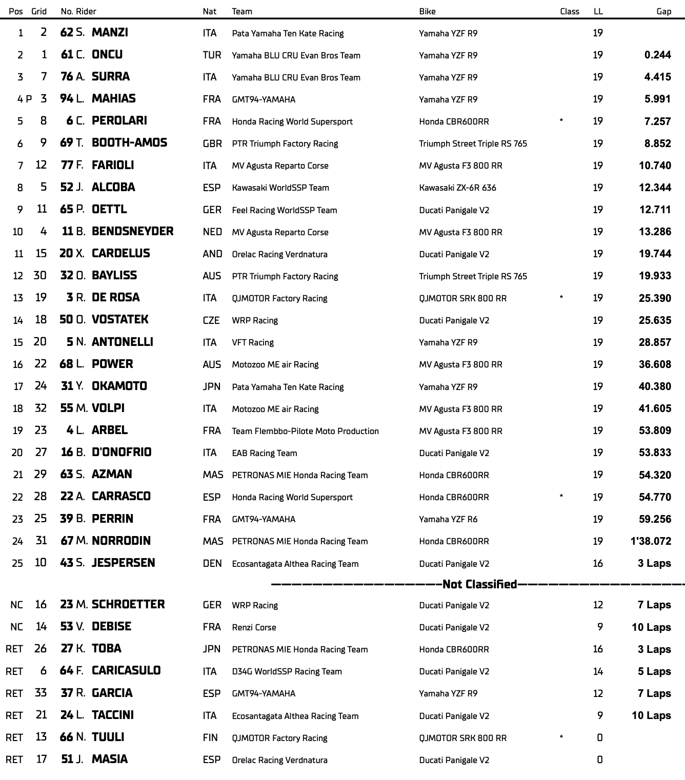Corentin Perolari (Honda) décroche sa meilleure performance de la saison avec une cinquième place, devant Tom Booth-Amos (PTR Triumph) et Filippo Farioli (MV Agusta), tandis que Jeremy Alcoba (Kawasaki) et Bo Bendsneyder (MV Agusta) complètent le Top 10, composé de six marques différentes. Raffaele De Rosa (QJMOTOR) marque le meilleur résultat de la marque chinoise depuis son arrivée dans la discipline, tandis que le peloton a connu pas moins de six abandons, dont celui de Federico Caricasulo (Ducati) alors en bagarre pour le top 8.