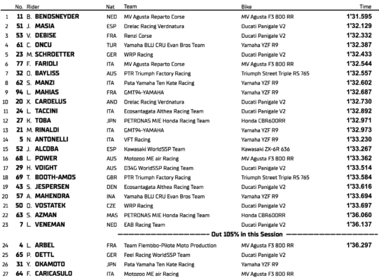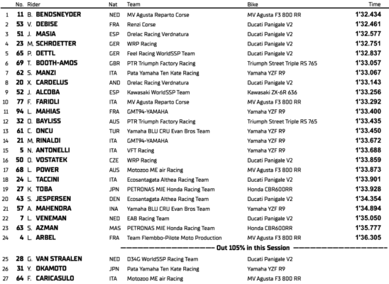 La première Yamaha du classement général n’est autre que celle de Can Oncu (BLU CRU Evan Bros Racing). 13e lors de la première journée, le Turc fait partie de ceux qui ont le plus progressé dans la hiérarchie. Il achève la séance avec un temps en 1:32,387, à peine plus lent que celui de Valentin Debise. L’Allemand Marcel Schroetter (WRP Racing) complète le top-5, y plaçant une troisième Ducati Panigale V2.