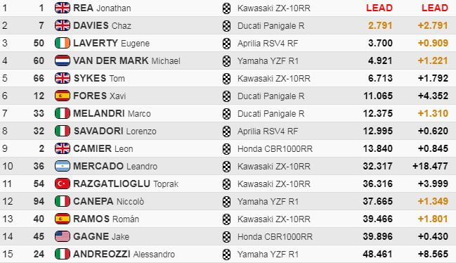Rea creusait une avance d’une demi-seconde sur Tom Sykes, et d’environ une seconde sur Eugene Laverty. Chaz Davies, auteur d’un bon départ depuis la troisième ligne, occupait la quatrième position à 1.5.