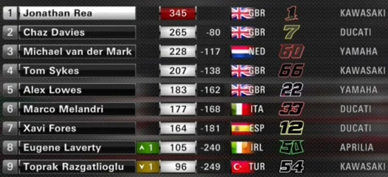 Marco Melandri passait septième en doublant Lorenzo Savadori. Johnny Rea l’emportait avec une belle avance de 2.7 sur Chaz Davies, suivi d’Eugene Laverty, Michael van der Mark et Tom Sykes.