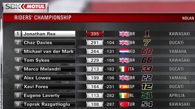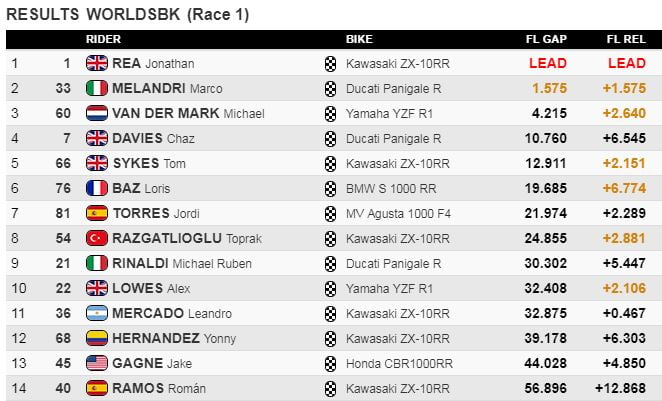 Rea s’envolait en tête, suivi de Melandri et de Savadori. Van der Marl perdait un peu de temps à doubler Sykes et se retrouvait quatrième à une seconde. Loris Baz pointait neuvième à 3.4. Chaz Davies remontait brillamment en cinquième position, à 2.6 à 17 tours du drapeau à damier. Rea creusait un écart d’une seconde sur Melandri et Savadori, et de trois sur van der Mark et Davies. Baz huitième pointait à huit secondes.