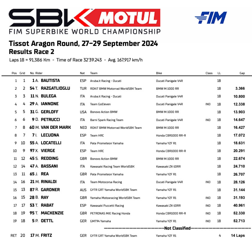 L’as de BMW avait manqué les deux manches précédentes en raison de sa blessure à Magny-Cours et avait vu l’écart au classement se réduire à 13 points. Le Motorland était le piège idéal pour mettre la BMW dans les cordes, mais au lieu de cela Nicolò Bulega, entre pannes mécaniques et problèmes divers, sauve le podium mais se retrouve à 39 points. Il en reste 124 en jeu, tout est encore possible. Mais aujourd’hui, Toprak Razgatlioglu a envoyé un signal de champion : quand il ne peut pas gagner, il limite les dégâts au maximum. Il sera difficile de le rattraper.