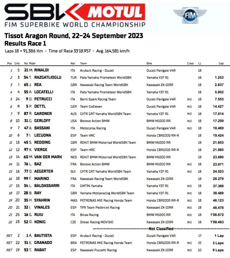 Après le désastre de 2019, y aura-t-il à nouveau un cas Alvaro Bautista en Superbike ? La question se pose spontanément après les deux chutes qui ont empêché l’Espagnol de remporter le succès espéré en Course 1 à Motorland Aragon. La 20ème perle de cette saison aurait pu être le coup de grâce pour le Championnat du Monde, mais cette double erreur remet tout en question. Toprak Razgatlioglu n’est plus qu’à 37 points de la tête, après en avoir englouti vingt d’un coup. Il reste huit défis à relever, et à ce rythme, nous allons assister à de belles choses. Entre-temps, un splendide Michael Rinaldi a renoué avec le succès en se détachant à domicile, empêchant le Turc de faire le plein de points, préservant ainsi cinq points à son coéquipier étourdi. Ce fut une belle course, couronnée par un Jonathan Rea en grande forme (troisième) et le retour supersonique de Danilo Petrucci : de dernier à cinquième. Sans cette maudite chute en Superpole, qui sait comment cela se serait terminée…