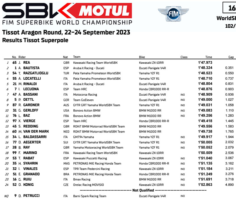 Donnez-lui une Superbike à la hauteur, et il l’exploitera au mieux. Jonathan Rea signe la 42e pole position de son incroyable carrière, détruisant le record de Motorland Aragon. Il s’élance devant Alvaro Bautista et Toprak Razgatlioglu. Une chute dès le premier run ruine la qualification de Danilo Petrucci : il s’élancera en toute dernière position, après avoir terminé devant tout le monde lors des trois séances d’essais combinées.