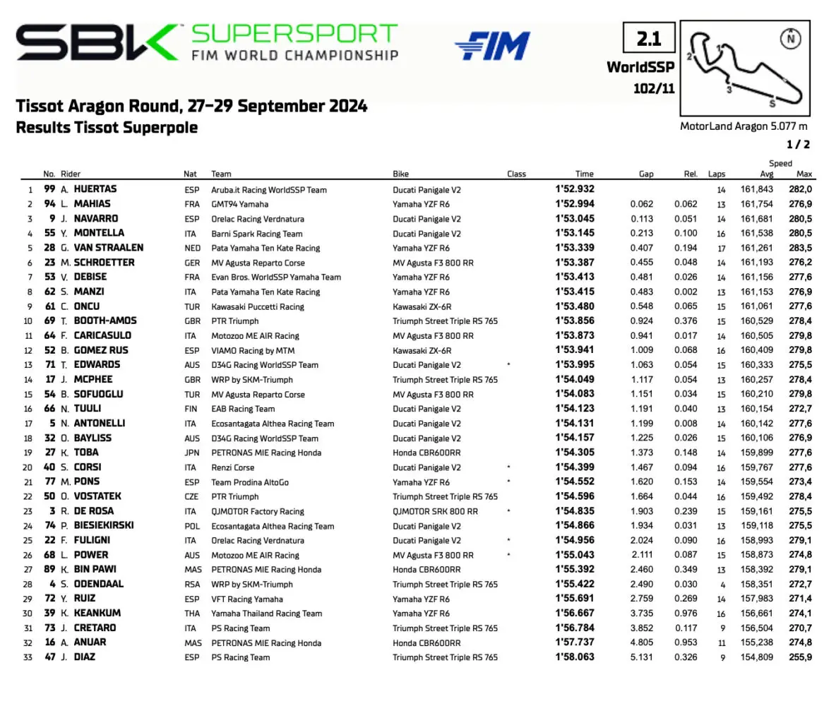 Le leader espagnol du championnat du monde Supersport, Adrian Huertas, s’élancera en pole dans sa course nationale à Aragon. Yari Montella manque la première ligne : adieu les rêves de titre mondial ?