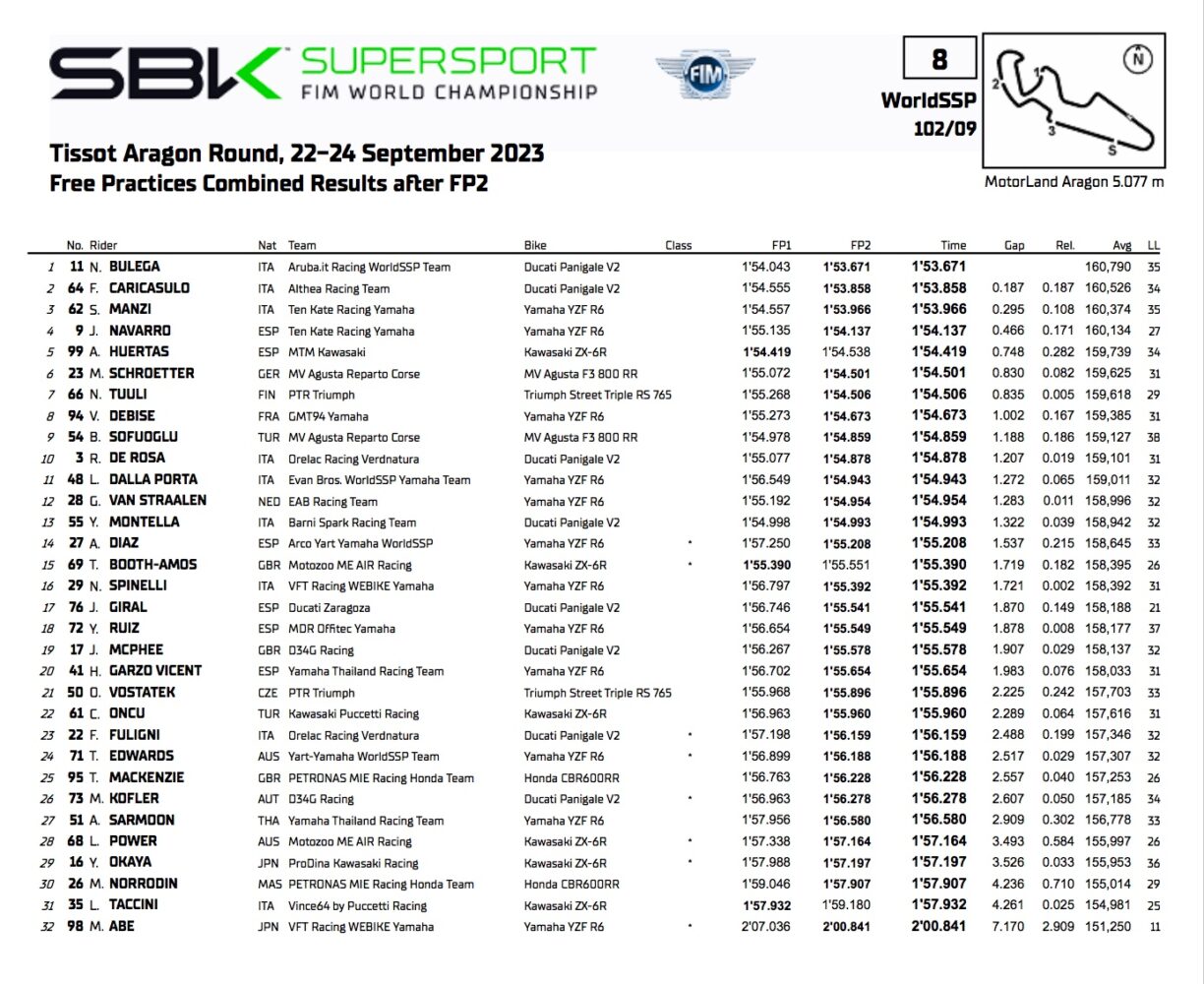 Il y a beaucoup de curiosité autour de l’ancien champion du monde Moto3 (2019) qui a fait deux manches en Supersport sur la Yamaha Evan Bros. La plupart étaient des essais, mais déjà à Magny Cours le Toscan était très fort, terminant sixième de la course 2. Ici, il connaît bien la piste, il a déjà un avantage, et il repart avec le onzième temps. A noter également le cinquième temps d’Adrian Huertas, l’Espagnol actuellement chez Kawasaki, prendra la place de Bulega chez Ducati Aruba l’année prochaine.