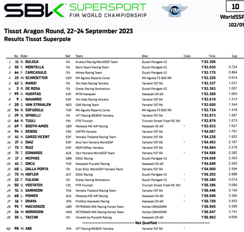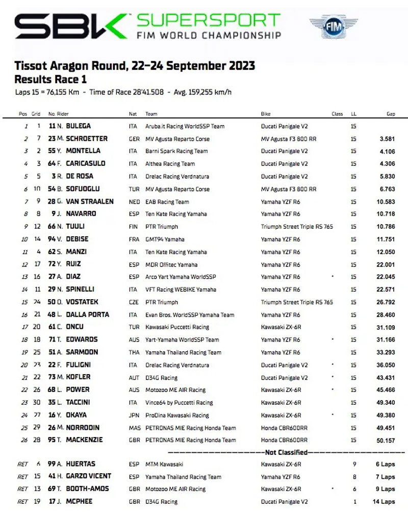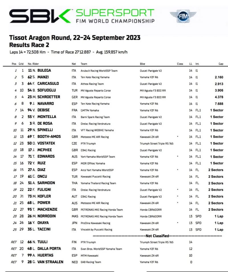 Peu avant le départ, Yari Montella est relégué en fond de grille, en raison de valeurs de pression de pneus non conformes. Le pilote Ducati Barni a cependant effectué une belle remontée, terminant en huitième position. Du côté des Ducati satellites, Federico Caricasulo a encore brillé en terminant sur la dernière marche du podium, manquant de peu une confrontation directe avec Manzi. Le week-end de Lorenzo Dalla Porta s’est terminé par une chute : son excellente performance à Magny Cours avait suscité un enthousiasme légitime, mais Aragon a été un échec définitif dans l’adaptation de l’ancien champion du monde de Moto3 au Supersport.