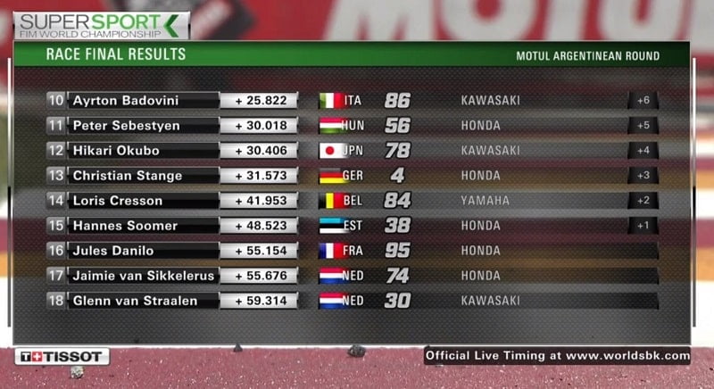 Avec 193 points, Randy Krummenacher en totalise 10 d’avance sur son coéquipier, Federico Caricasulo et ici en Argentine, il a sa première occasion de la saison de décrocher le titre. Pour cela, il faudra tout d’abord qu’il termine sur le podium, et de préférence, à la première place. Une victoire pour Krummenacher nécessiterait une cinquième place ou mieux de Caricasulo pour que la lutte pour le titre se poursuive au Qatar. Si l’Italien terminait sixième, alors Krummenacher deviendrait Champion du Monde.