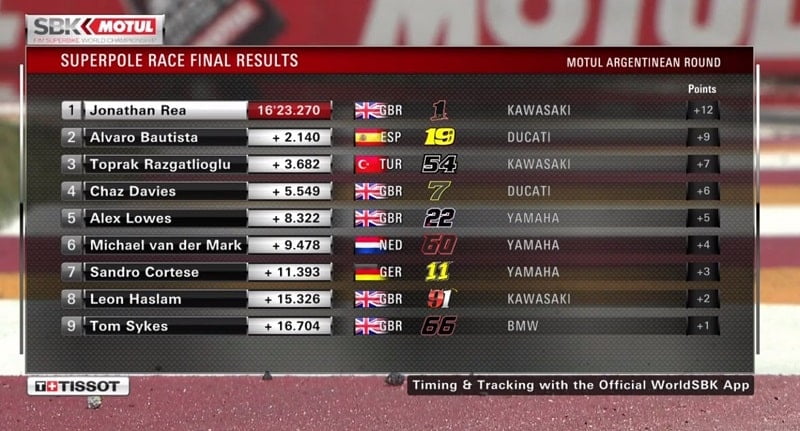 Rea était salué comme vainqueur par le drapeau à damier, devant Bautista et Razgatlioglu. Davies précédait ensuite Lowes, van der Mark, Cortese Haslam, Sykes et Mercado.