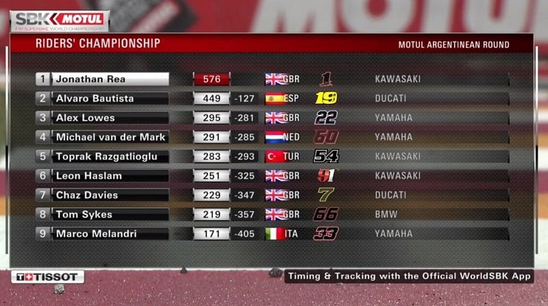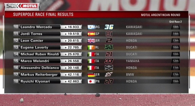 Rea augmentait son avantage à 1.7 sur Bautista et à 2.9 sur Razgatlioglu à la mi-course. Davies quatrième parvenait à distancer les Yamaha de Lowes, van der Mark et Cortese. Haslam, Sykes et Camier étaient attaqués par le local Tati Mercado, pour la plus grande joie des afficionados argentins !