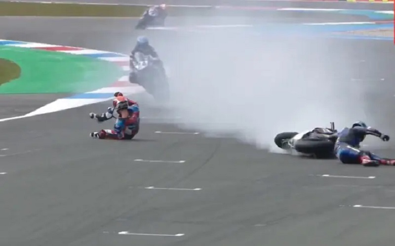 Qui d’autre ? Stefano Manzi a été le plus rapide lors des premiers essais Supersport et c’est un résultat attendu, pour plusieurs raisons. Le Romagnol connaît bien Assen pour y avoir disputé des GP, mais surtout… il joue à domicile. Oui, car la glorieuse Ten Kate, championne du monde de la catégorie ces deux dernières saisons, est basée à seulement 50 kilomètres du circuit et sera ici sous les feux de la rampe. Dans la soirée, elle présentera sa nouvelle livrée et (enfin…) un sponsor de premier plan, Motonext. Ajoutez à cela le fait que Stefano Manzi et son coéquipier Jorge Navarro ont roulé ici il y a quelques jours, car Assen est manifestement la piste d’essai de l’équipe locale. Le défi lancé au leader du championnat du monde, Ducati, avec Nicolò Bulega, est déjà relevé. La chute prématurée de Oliver Bayliss, avec la Ducati touchée par Jorge Navarro : Les pilotes s’en sortent bien.