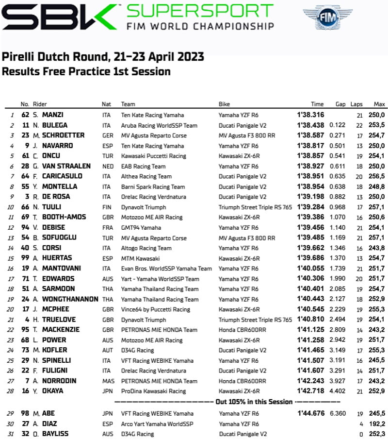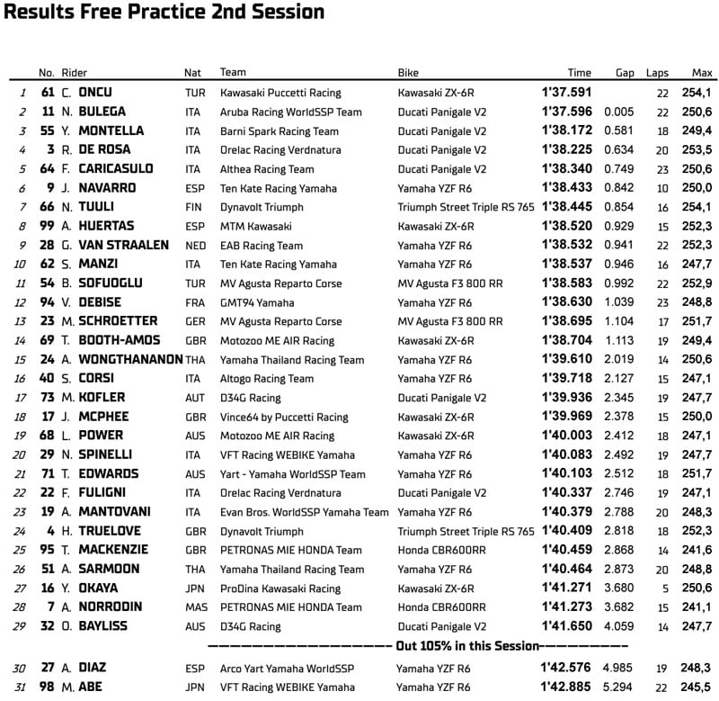 La première Yamaha R6 est celle de Jorge Navarro, qui a chuté en début de séance et a réalisé le sixième temps, à 842 millièmes du leader. Derrière lui, on retrouve la Triumph de Niki Tuuli (+0″854) et la Kawasaki d’Adrian Huertas (+0″924). Le top 10 est complété par les Yamaha de Glenn van Straalen et Stefano Manzi. On attendait quelque chose de plus de ce dernier, après qu’il ait terminé la FP1 en tête.