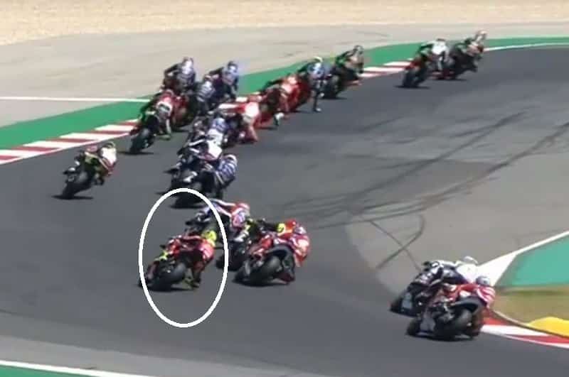 Moyennement parti lors de la Course 1, Álvaro Bautista n’a pas apprécié du tout le contact qu’il a eu avec son coéquipier Chaz Davies dans le premier virage et qui l’a envoyé à l’extérieur des limites de la piste (photo ci-dessus), à la suite de quoi il se retrouvait presque bon dernier.