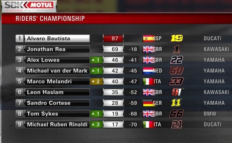 Rea perdait un peu de temps sur Bautista, qui le suivait à 0.2 à 13 tours de la fin. Lowes se battait pour la troisième place à plus de 4 secondes avec van der Mark, Haslam et Melandri.