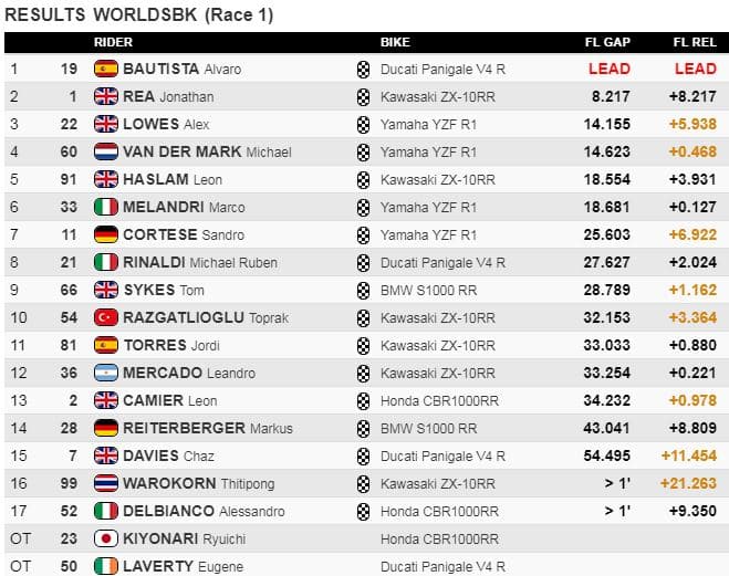 Bautista l’emportait finalement largement devant Rea, Lowes, van der Mark, Haslam, Melandri, Cortese et Melandri.