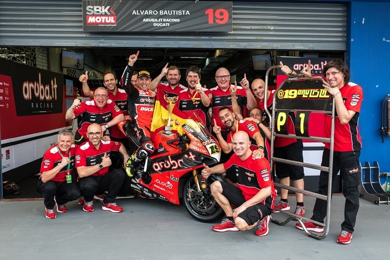Après la Course 1, Álvaro Bautista n’était pas triomphateur. Sans parler de l’incident traité par ailleurs, l’Espagnol précisait « je ne me sentais pas à l’aise avec la moto : ça allait bien le matin mais dans l’après-midi j’avais des difficultés à freiner dans les virages. Et à l’accélération, je souffrais aussi un peu. Malgré cela, j’ai encore gagné et je suis heureux même si le sentiment n’était pas parfait ».